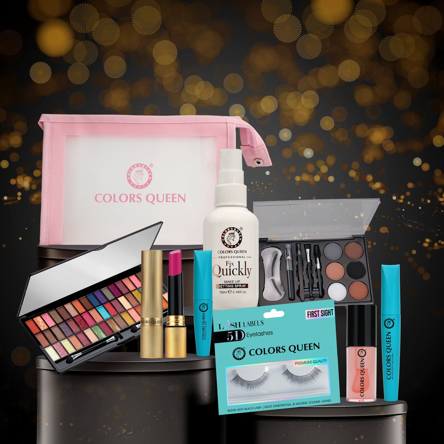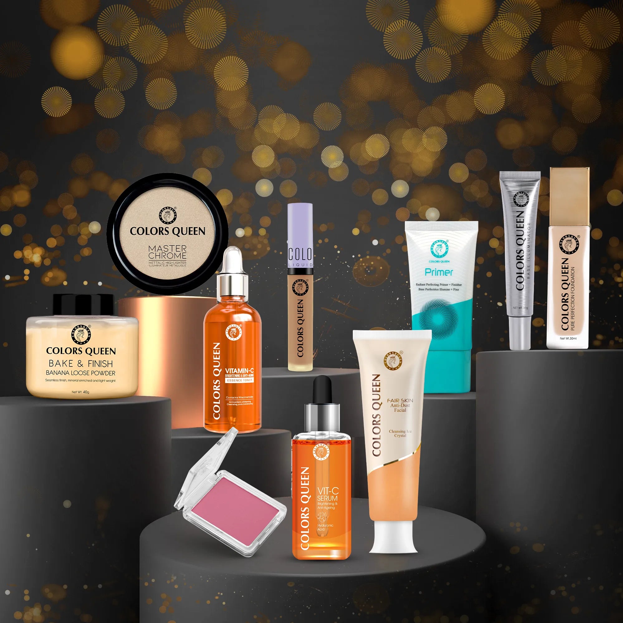 We are aware that every time you see something, you want it but are unable to get it since the products are not available in a single collection. To solve this issue, we are introducing the Colors Queen Glam Ready Bridal Makeup kit – your ultimate kit for a flawless, glamorous look! Exceptional products are included in this all-in-one vanity to ensure that you always look professional. This collection includes everything you need to effortlessly create stunning makeup looks, whether you are perfecting your base, defining your eyes, or highlighting your lips. Every product, from the master chrome highlighter to the long-lasting foundation, is expertly chosen to showcase your best features.