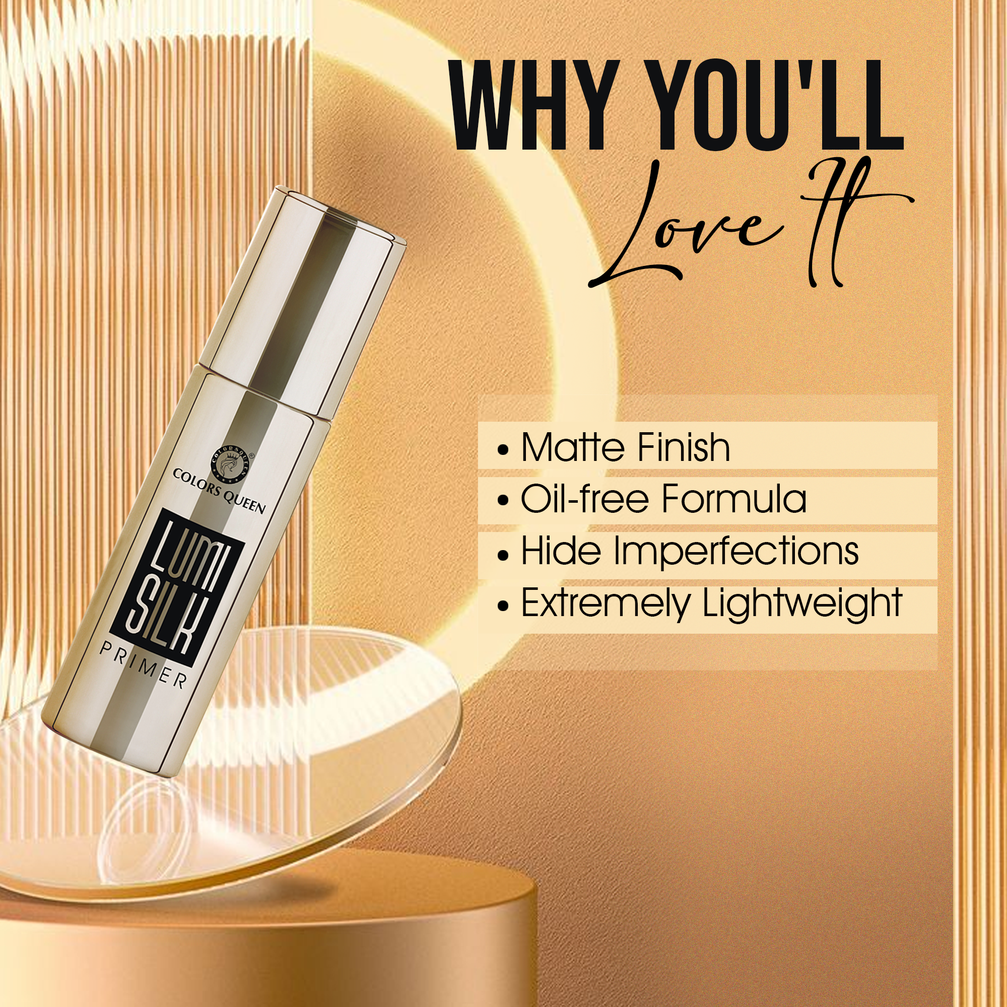 When you possess the best attributes, do not let any flaw become apparent. Maintain your base so strong that even your attitude can be carried off with a graceful beauty. Presenting Colors Queen Lumi Silk Primer, a ground-breaking product that gives your makeup routine a glowing start. What if you deserve the right spot but someone else takes it? Do not give anyone the chance. As pores are blurred and a flawless, refined base is created, witness the magic. This primer's silky texture provides a backdrop to your beauty creations, setting the stage for a flawless makeup application. Grip onto your foundation effortlessly, ensuring it stays in place for a flawless and long-lasting finish. Specially designed for dry skin, this primer provides hydration and nourishment, ensuring your makeup not only looks great but also feels comfortable throughout the day.